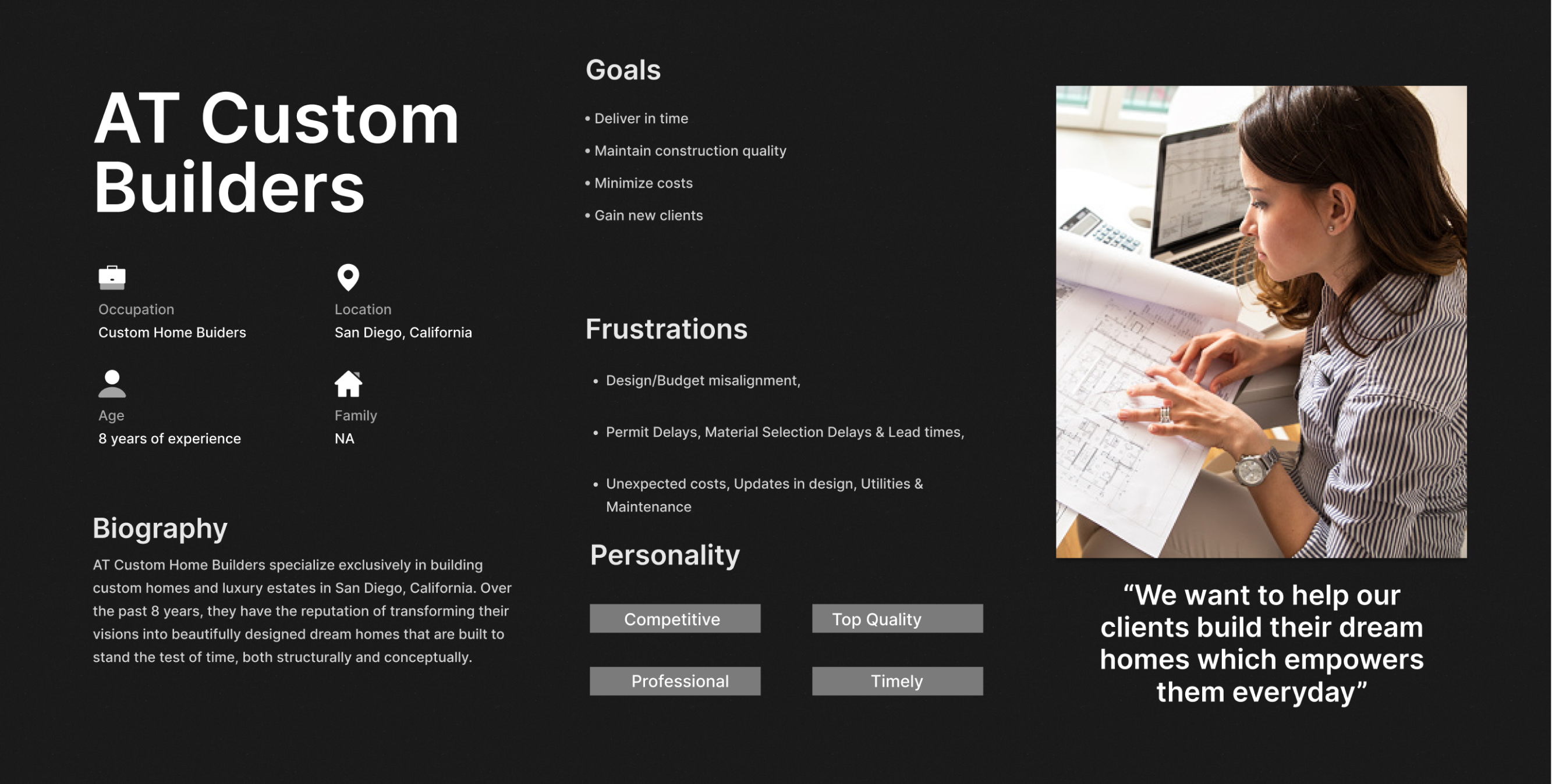 Interviews with new home builders and new home owners were conducted to understand the user needs. These interviews were semi-structures. Participants were identified on social media platforms like Linkedln. The findings from user research were represented with the help of Personas.